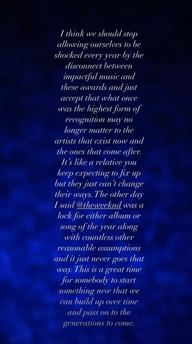 I think we should stop allowing ourselves to be shocked every year by the disconnect between impactful music and these awards. This is a great time for somebody to start something new that we can build up over time and pass on to the generations to come.